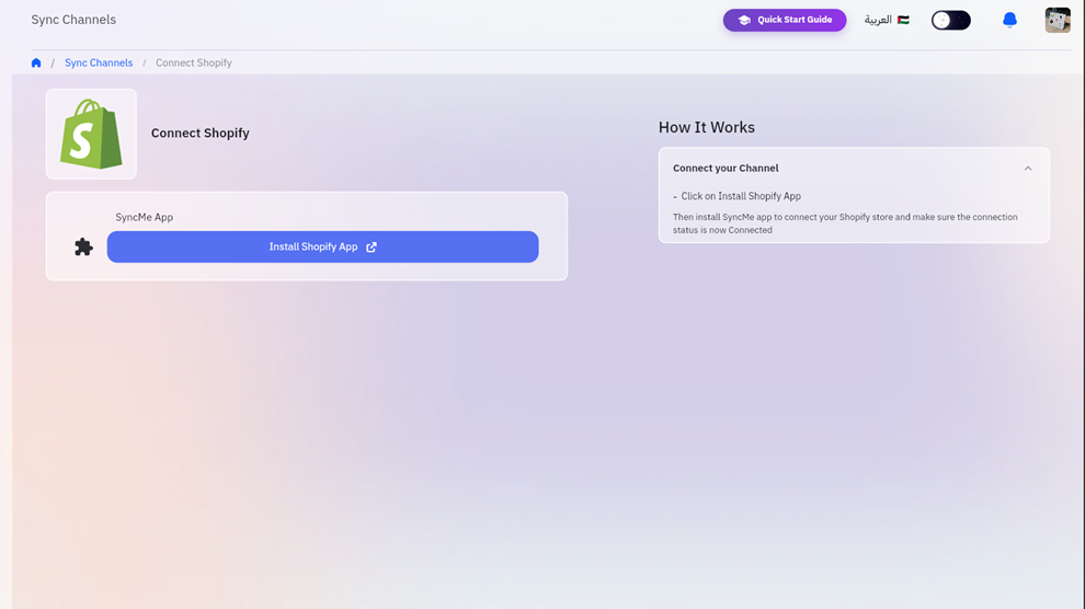 Once installation is complete, return to SyncMe and verify that the Shopify channel is marked as Connected in your list of channels.
