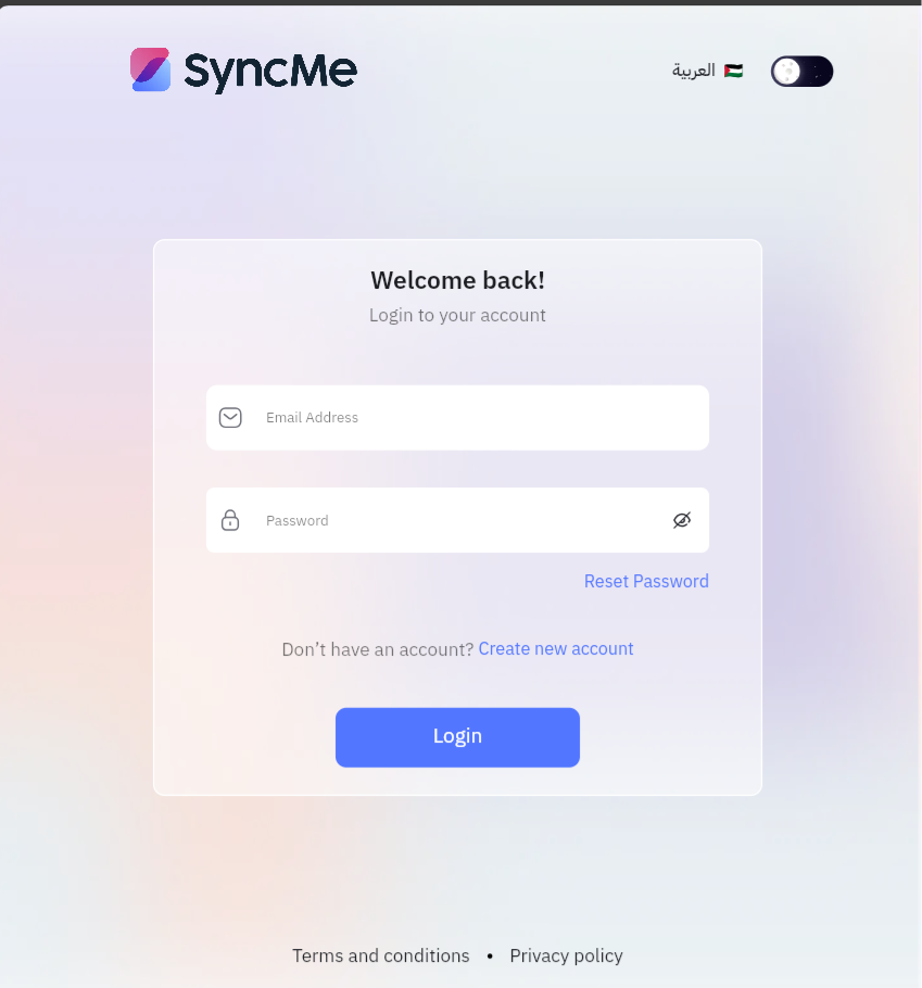 Access SyncMe from the login screen. If you are new, create an account first. If you already have an account, log in with your email and password.
